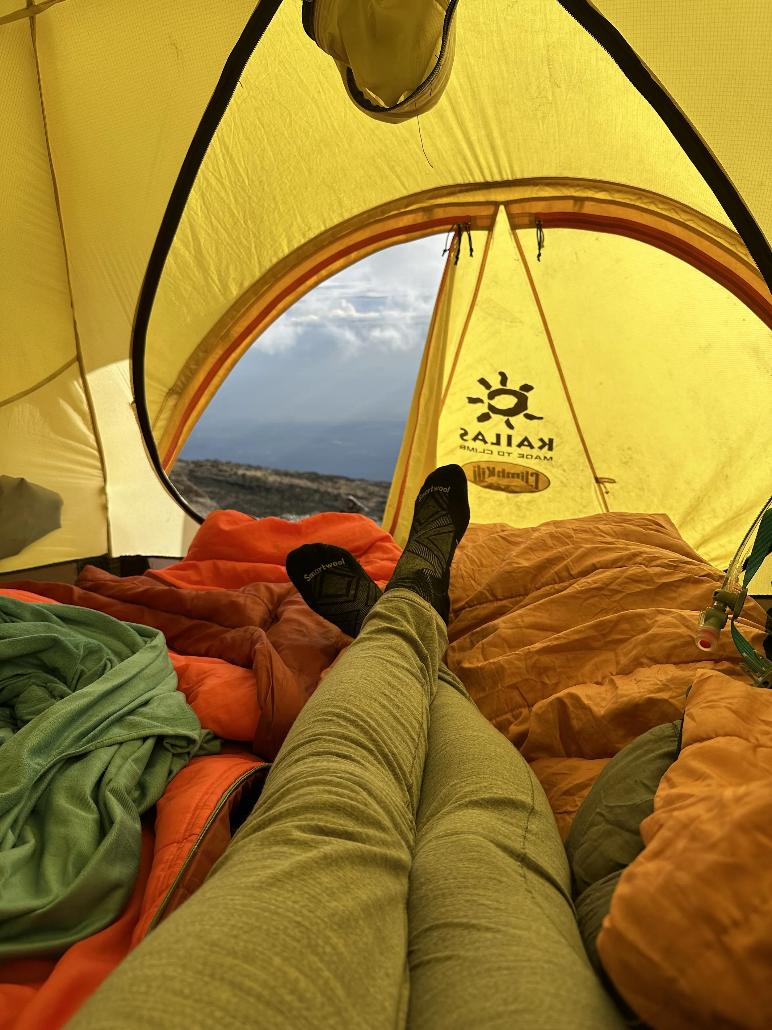 The sun hit the tent to warm it just long enough for us to strip down and give ourselves a luxurious mountain bath (baby wipes), and we napped and relaxed until dinner.