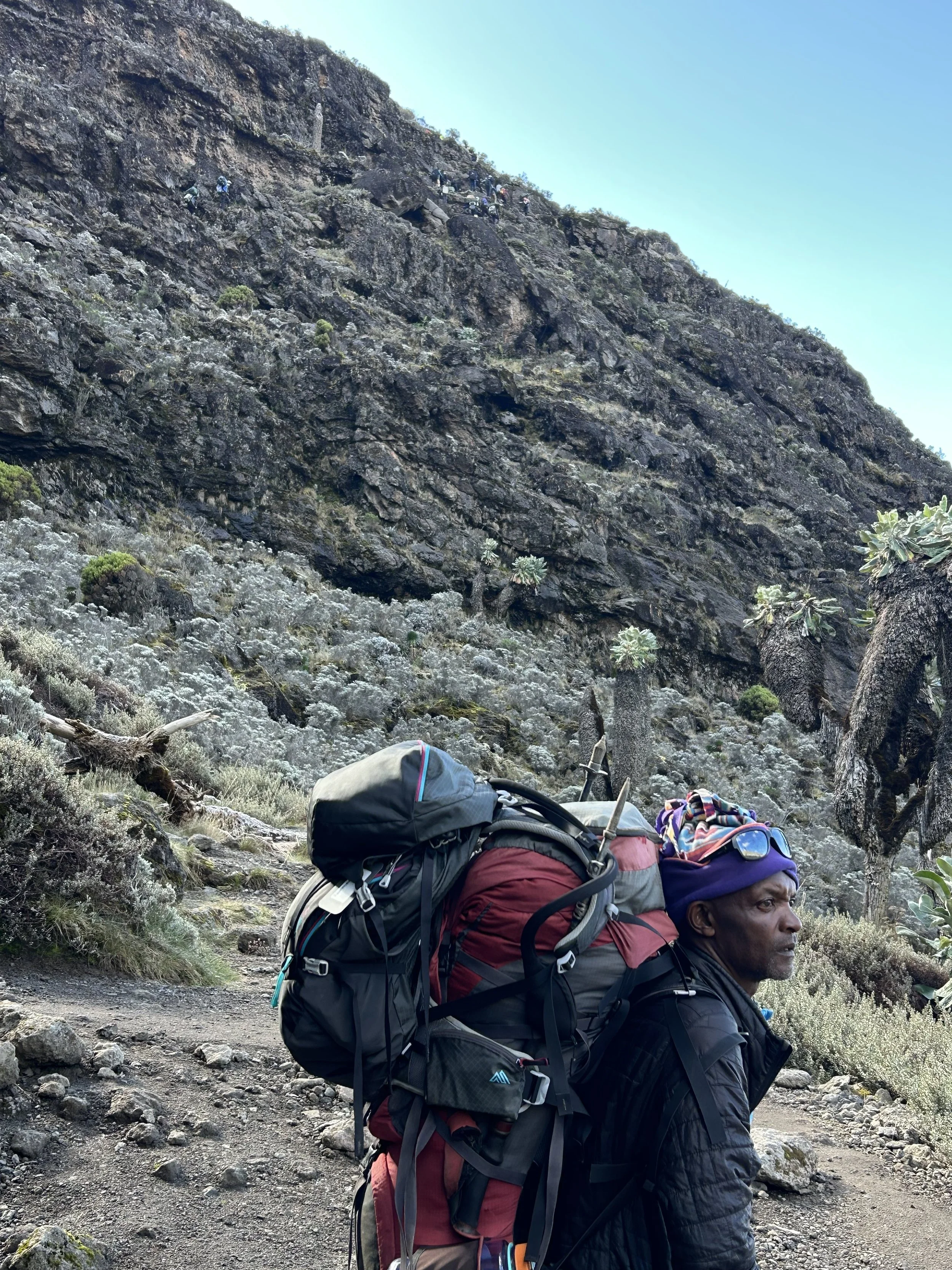 At the top of the wall, I vented: “What the hell was that?” Seraphin just shook his head. “I bet HE hasn’t climbed Kilimanjaro 350 times [like Seraphin],” I muttered. Seraphin laughed. Erick smirked, “Maybe 14!”