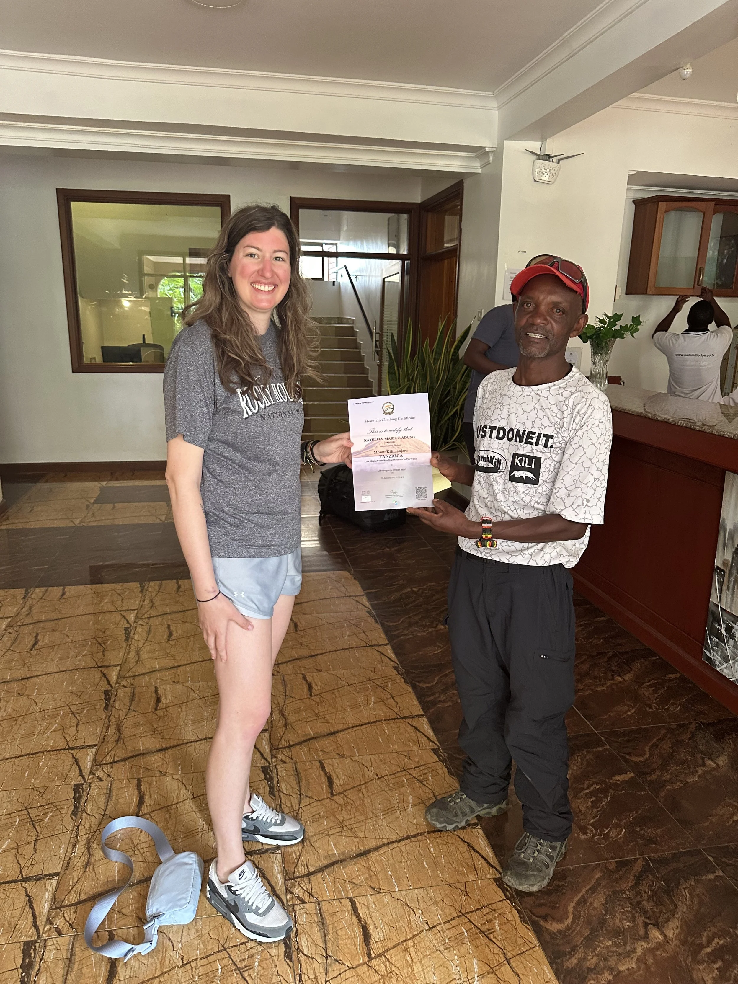 The next day Sue and the whole crew returned to the hotel as scheduled. I was happy to get to give them proper hugs and thank yous, and to my relief, Seraphin presented me with my summit certificate!! Finally, we said goodbye to our crew friends, exchanged numbers with the guides, and celebrated with hard-earned Kilimanjaro beers.