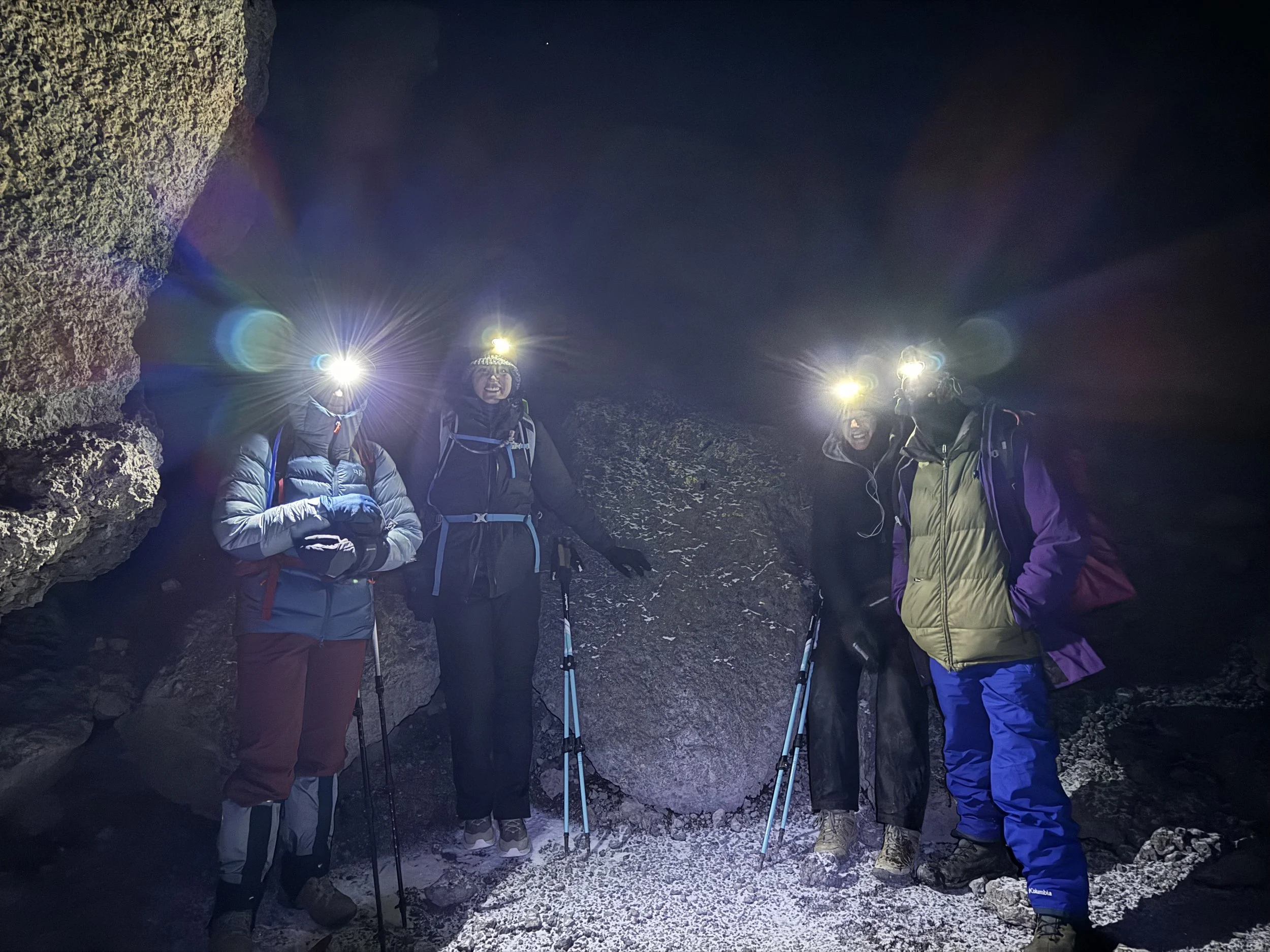 Almost immediately, I felt the altitude in my lungs—shallow breaths, never enough oxygen. The hours blurred together. Around 2 a.m., Mom sat down and said she couldn’t go on. Erick and Seraphin tried encouragement, but she was weak and insisted she’d never make it down. We reshuffled our bags, and Erick escorted her back down.